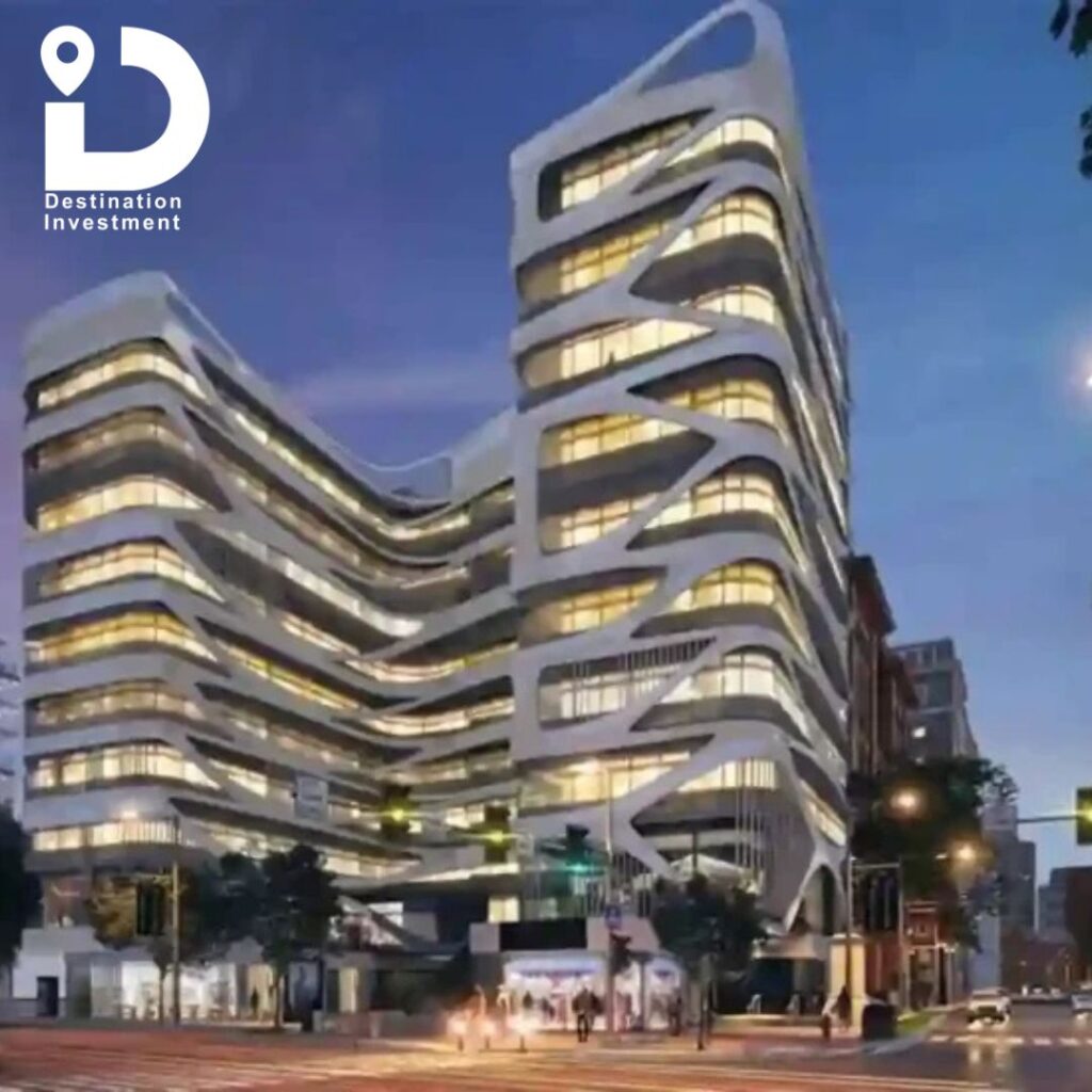 المبنى يتميز بواجهة بطول 130 متر، ومعظم الوحدات بتطل على البنوك وحديقة البنك المركزي وعلى محاور رئيسية.
